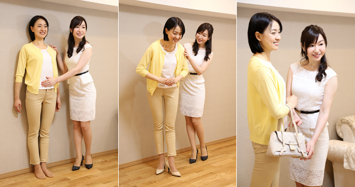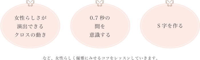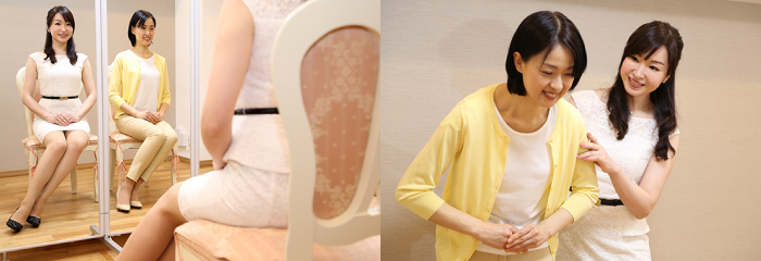 ひらひらと揺れる広がったシルエットのスカートと、タイトなスカートでは美しく見える歩き方も座り方も異なります。エレガント、カジュアル、スタイリッシュなど、ご自身のキャラクターと服装のタイプごとに演出したい雰囲気を決め、実際に歩いたり座ったり上着の着脱などをしていただき、手元を含めた美しい動き方をレッスンしていきます。実際の場面で活かせる内容であることが大切です。